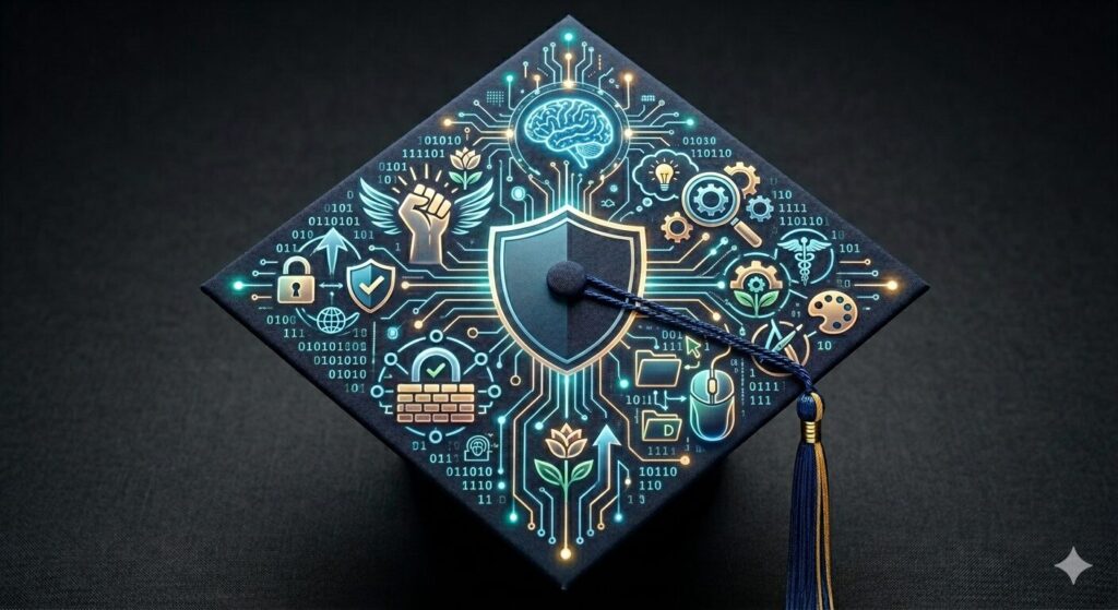 Nano Banana Prompt: Digital Fluency graduation cap…no words on the cap but include images that represent empowerment, safety, critical thinking, a file system and mouse and industry inclusivity